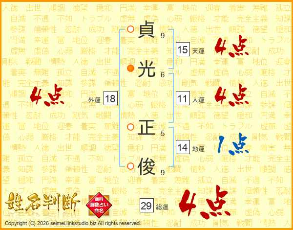 あなたの人生を表す1番重要な運勢です。生涯を通じて影響する総合運となり、主に50歳以降の晩年期に影響を及ぼします。苗字と名前の合計画数。