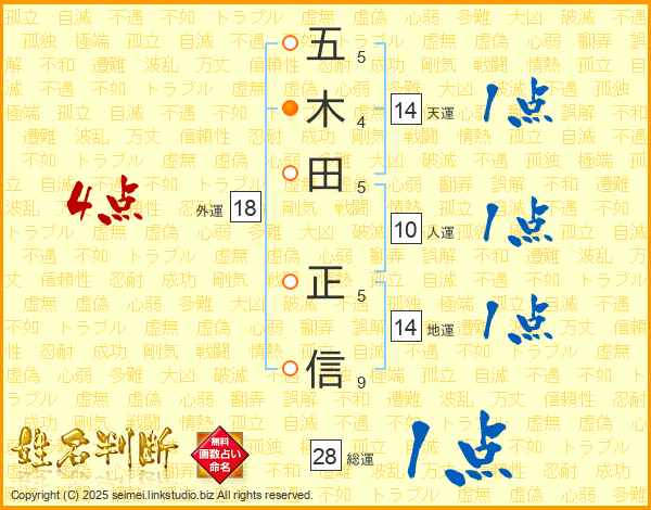 五(5画)木(4画)田(5画) 正(5画)信(9画)