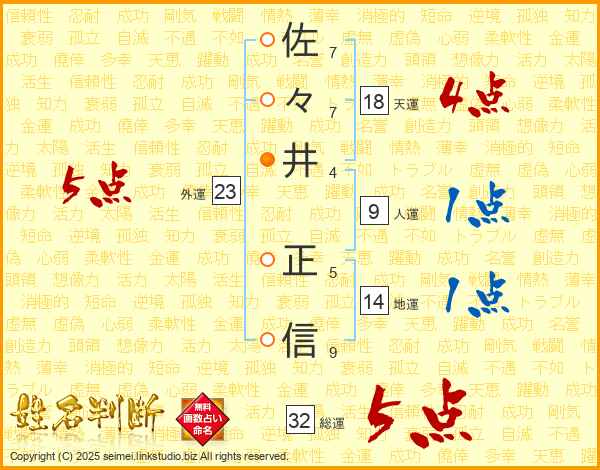 佐(7画)々(7画)井(4画) 正(5画)信(9画)