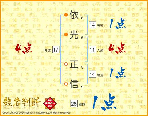 生活面を象徴する運勢です。外部から受ける影響力を表し、結婚運、家庭運や職場、環境への順応性を表します。総運から人運を引いた画数。姓や名が1文字の場合を除く。