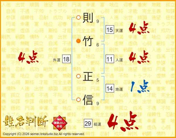 あなたの人生を表す1番重要な運勢です。生涯を通じて影響する総合運となり、主に50歳以降の晩年期に影響を及ぼします。苗字と名前の合計画数。