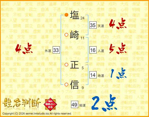 あなたの人生を表す1番重要な運勢です。生涯を通じて影響する総合運となり、主に50歳以降の晩年期に影響を及ぼします。苗字と名前の合計画数。