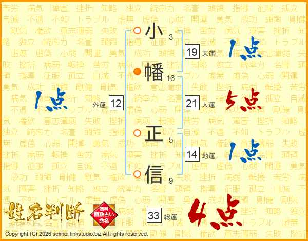 生活面を象徴する運勢です。外部から受ける影響力を表し、結婚運、家庭運や職場、環境への順応性を表します。総運から人運を引いた画数。姓や名が1文字の場合を除く。