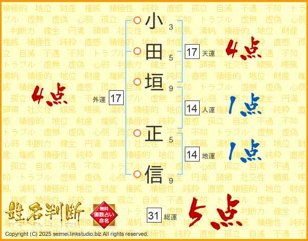 小(3画)田(5画)垣(9画) 正(5画)信(9画)