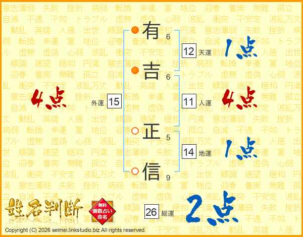 生活面を象徴する運勢です。外部から受ける影響力を表し、結婚運、家庭運や職場、環境への順応性を表します。総運から人運を引いた画数。姓や名が1文字の場合を除く。