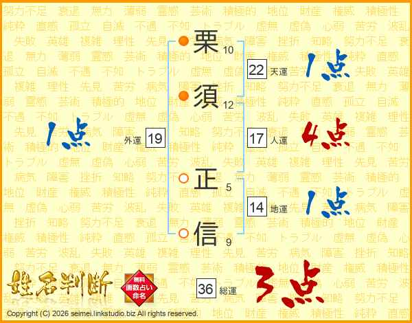 生活面を象徴する運勢です。外部から受ける影響力を表し、結婚運、家庭運や職場、環境への順応性を表します。総運から人運を引いた画数。姓や名が1文字の場合を除く。