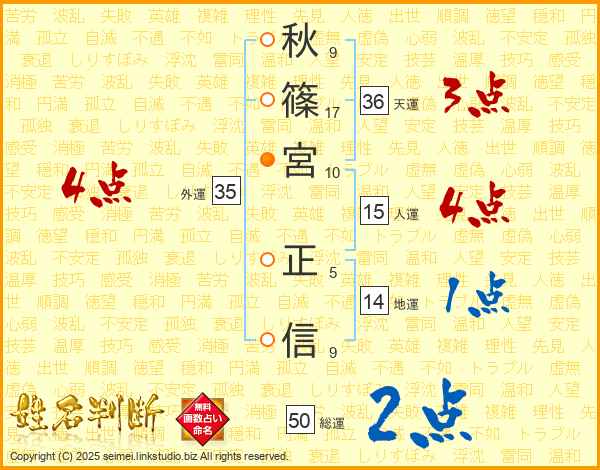秋(9画)篠(17画)宮(10画) 正(5画)信(9画)