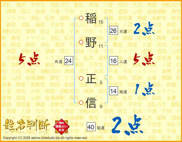あなたの人生を表す1番重要な運勢です。生涯を通じて影響する総合運となり、主に50歳以降の晩年期に影響を及ぼします。苗字と名前の合計画数。