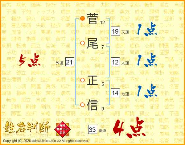 菅(12画)尾(7画) 正(5画)信(9画)