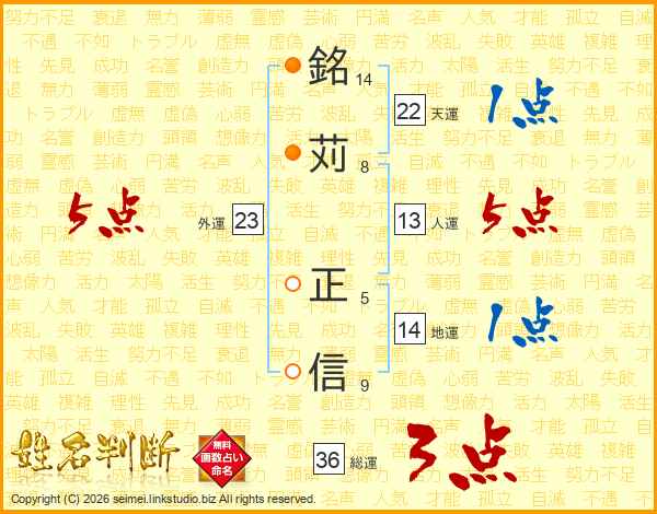 生活面を象徴する運勢です。外部から受ける影響力を表し、結婚運、家庭運や職場、環境への順応性を表します。総運から人運を引いた画数。姓や名が1文字の場合を除く。