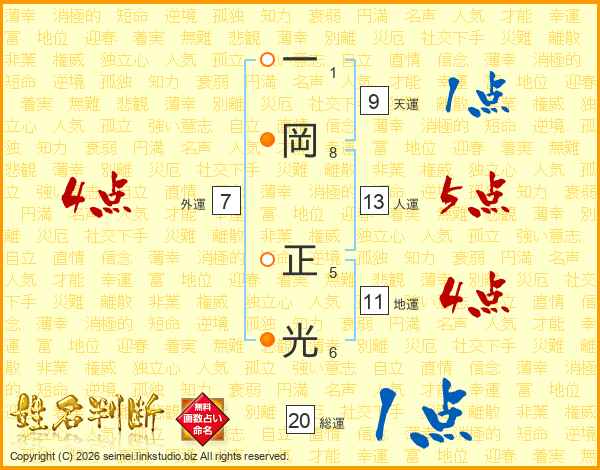 生活面を象徴する運勢です。外部から受ける影響力を表し、結婚運、家庭運や職場、環境への順応性を表します。総運から人運を引いた画数。姓や名が1文字の場合を除く。