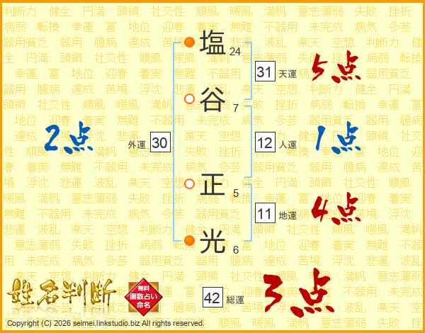 塩(24画)谷(7画) 正(5画)光(6画)