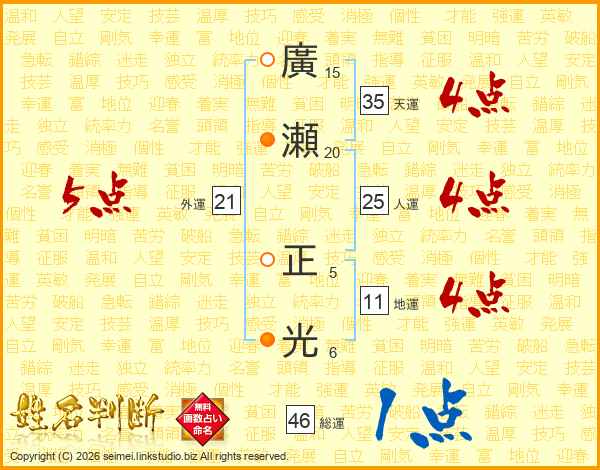 廣(15画)瀬(20画) 正(5画)光(6画)
