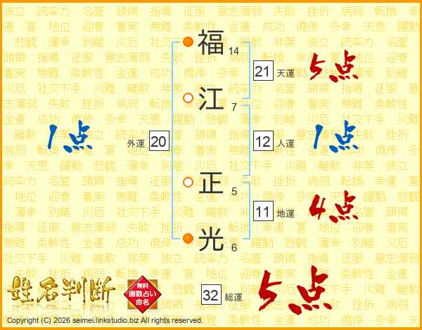 生活面を象徴する運勢です。外部から受ける影響力を表し、結婚運、家庭運や職場、環境への順応性を表します。総運から人運を引いた画数。姓や名が1文字の場合を除く。