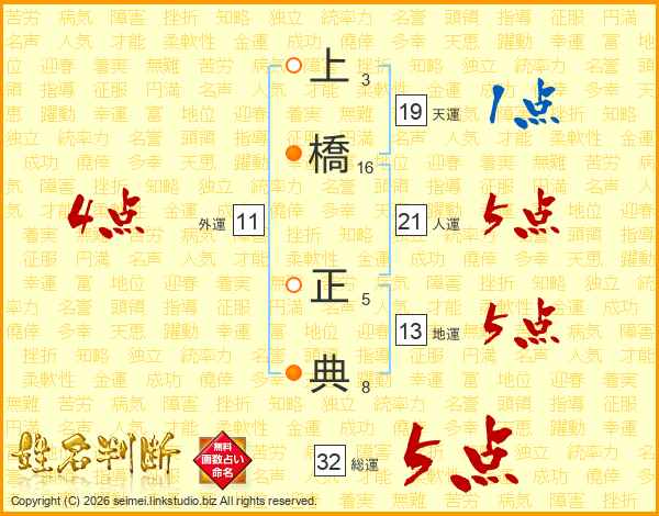 上橋正典さんの総運は32画の5点!