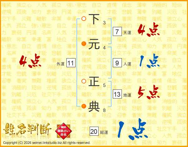 あなたの人生を表す1番重要な運勢です。生涯を通じて影響する総合運となり、主に50歳以降の晩年期に影響を及ぼします。苗字と名前の合計画数。