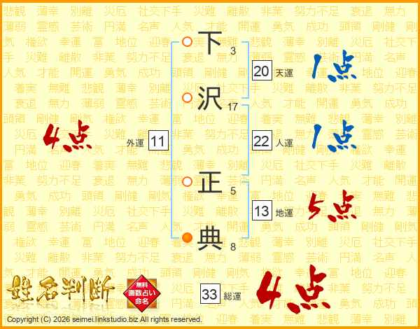 生活面を象徴する運勢です。外部から受ける影響力を表し、結婚運、家庭運や職場、環境への順応性を表します。総運から人運を引いた画数。姓や名が1文字の場合を除く。