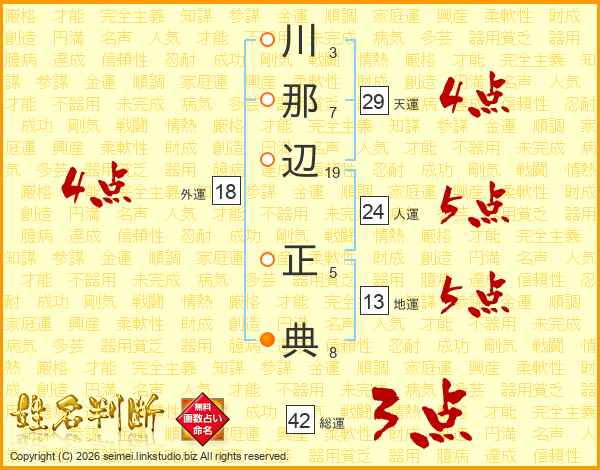 川(3画)那(7画)辺(19画) 正(5画)典(8画)