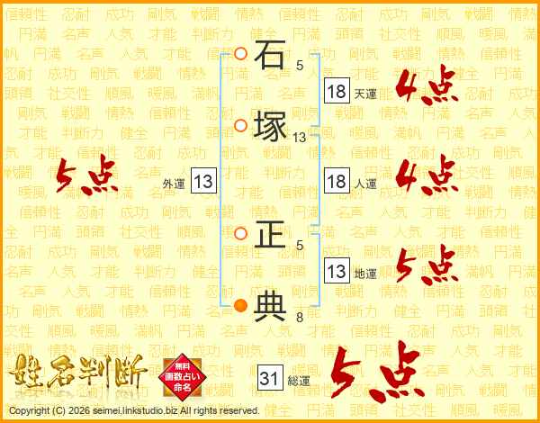 あなたの人生を表す1番重要な運勢です。生涯を通じて影響する総合運となり、主に50歳以降の晩年期に影響を及ぼします。苗字と名前の合計画数。