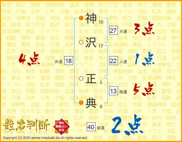 生活面を象徴する運勢です。外部から受ける影響力を表し、結婚運、家庭運や職場、環境への順応性を表します。総運から人運を引いた画数。姓や名が1文字の場合を除く。