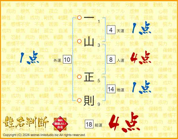 生活面を象徴する運勢です。外部から受ける影響力を表し、結婚運、家庭運や職場、環境への順応性を表します。総運から人運を引いた画数。姓や名が1文字の場合を除く。