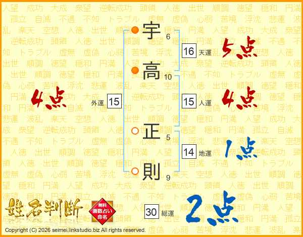 宇(6画)高(10画) 正(5画)則(9画)