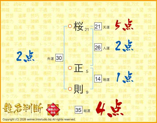 あなたの人生を表す1番重要な運勢です。生涯を通じて影響する総合運となり、主に50歳以降の晩年期に影響を及ぼします。苗字と名前の合計画数。