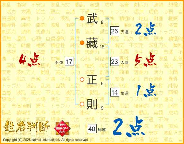 生活面を象徴する運勢です。外部から受ける影響力を表し、結婚運、家庭運や職場、環境への順応性を表します。総運から人運を引いた画数。姓や名が1文字の場合を除く。