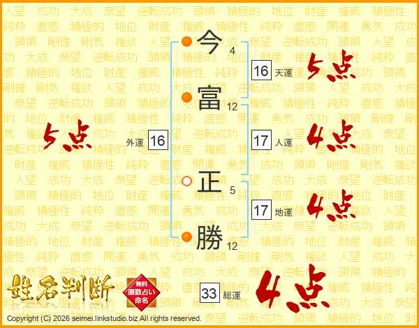 今(4画)富(12画) 正(5画)勝(12画)