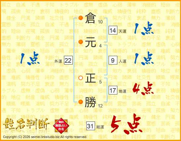 生活面を象徴する運勢です。外部から受ける影響力を表し、結婚運、家庭運や職場、環境への順応性を表します。総運から人運を引いた画数。姓や名が1文字の場合を除く。