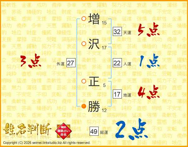 増(15画)沢(17画) 正(5画)勝(12画)