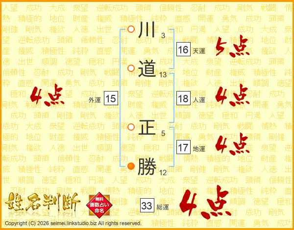 川(3画)道(13画) 正(5画)勝(12画)