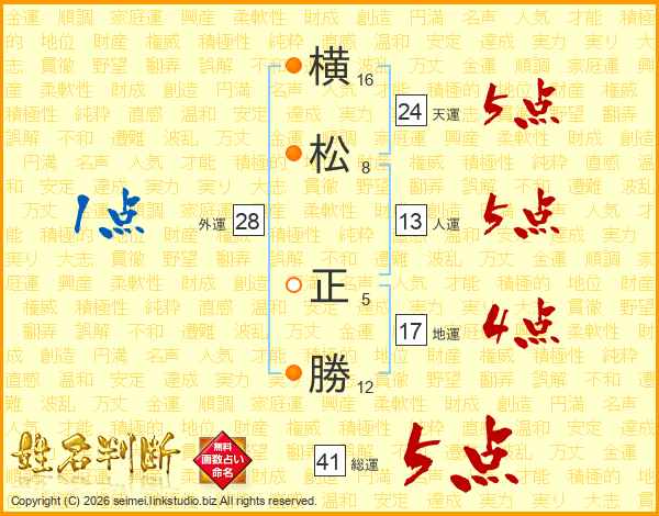 生活面を象徴する運勢です。外部から受ける影響力を表し、結婚運、家庭運や職場、環境への順応性を表します。総運から人運を引いた画数。姓や名が1文字の場合を除く。
