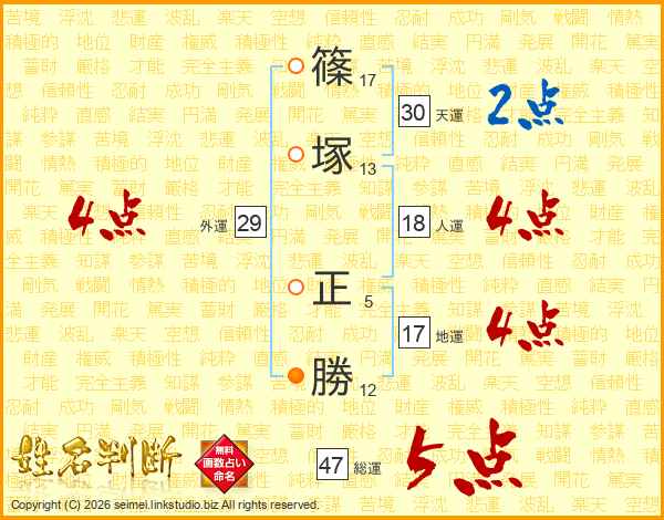 篠(17画)塚(13画) 正(5画)勝(12画)