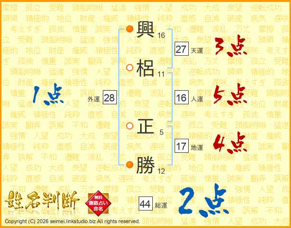興(16画)梠(11画) 正(5画)勝(12画)