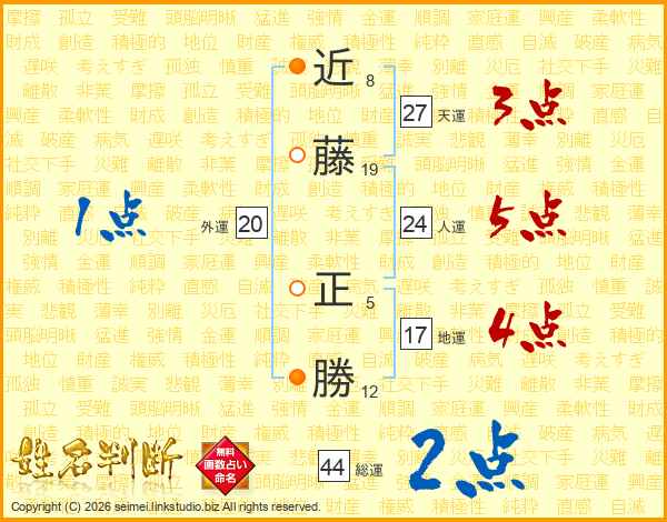 あなたの人生を表す1番重要な運勢です。生涯を通じて影響する総合運となり、主に50歳以降の晩年期に影響を及ぼします。苗字と名前の合計画数。