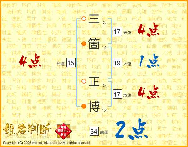 あなたの人生を表す1番重要な運勢です。生涯を通じて影響する総合運となり、主に50歳以降の晩年期に影響を及ぼします。苗字と名前の合計画数。