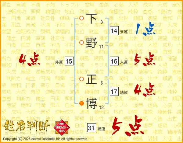 生活面を象徴する運勢です。外部から受ける影響力を表し、結婚運、家庭運や職場、環境への順応性を表します。総運から人運を引いた画数。姓や名が1文字の場合を除く。