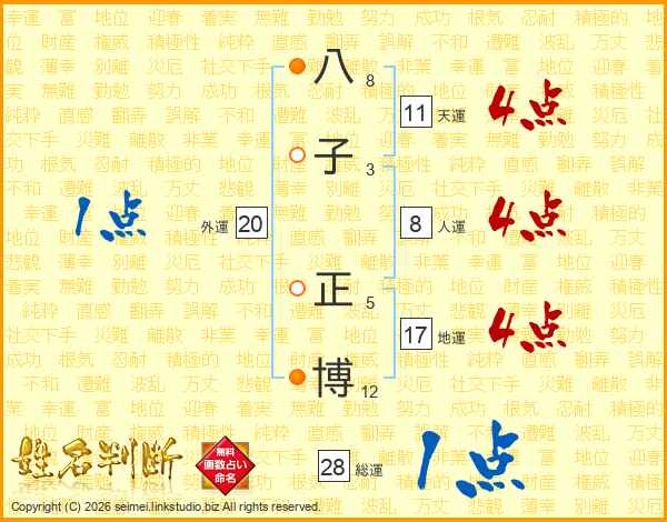 八(8画)子(3画) 正(5画)博(12画)