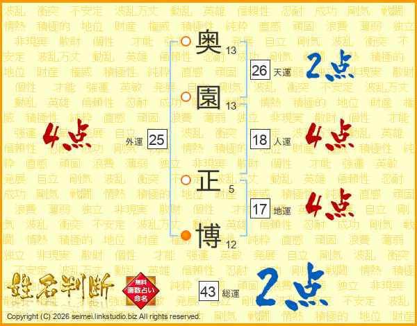 生活面を象徴する運勢です。外部から受ける影響力を表し、結婚運、家庭運や職場、環境への順応性を表します。総運から人運を引いた画数。姓や名が1文字の場合を除く。