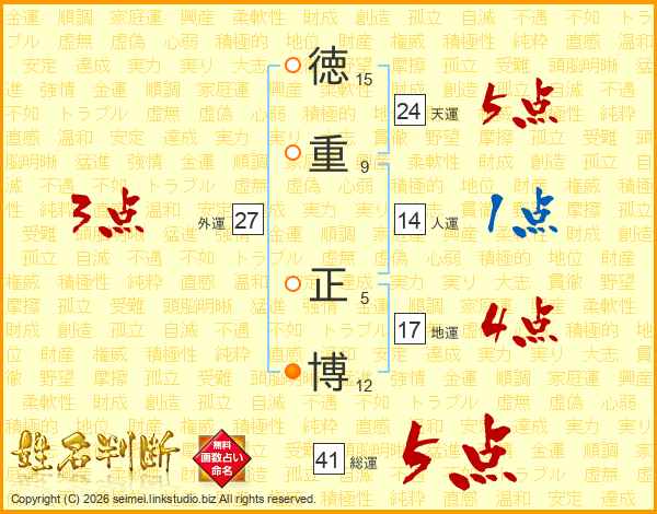 徳(15画)重(9画) 正(5画)博(12画)