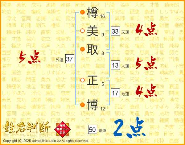 樽(16画)美(9画)取(8画) 正(5画)博(12画)
