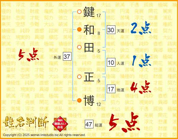 鍵(17画)和(8画)田(5画) 正(5画)博(12画)