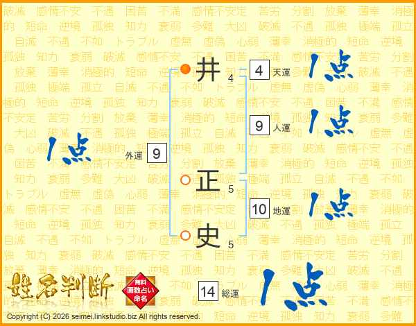 生活面を象徴する運勢です。外部から受ける影響力を表し、結婚運、家庭運や職場、環境への順応性を表します。総運から人運を引いた画数。姓や名が1文字の場合を除く。