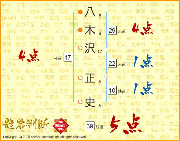 八木沢正史さんの総運は39画の5点!