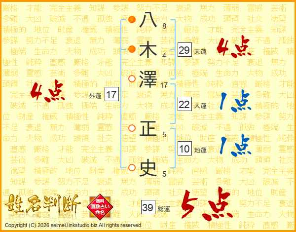 八木澤正史さんの総運は39画の5点!