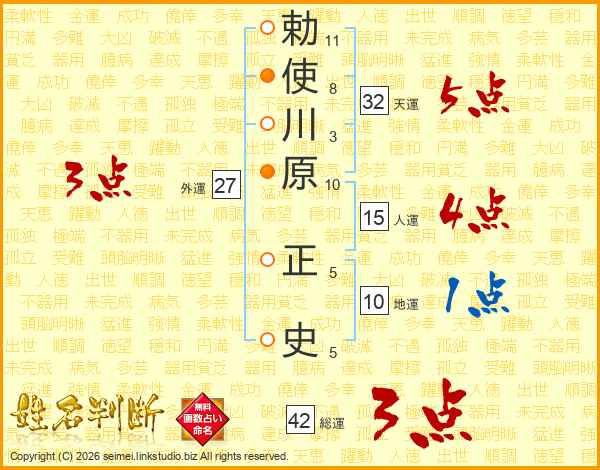 勅(11画)使(8画)川(3画)原(10画) 正(5画)史(5画)