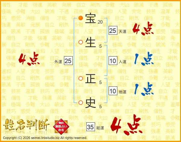 生活面を象徴する運勢です。外部から受ける影響力を表し、結婚運、家庭運や職場、環境への順応性を表します。総運から人運を引いた画数。姓や名が1文字の場合を除く。