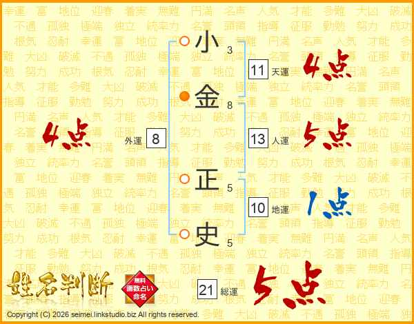 生活面を象徴する運勢です。外部から受ける影響力を表し、結婚運、家庭運や職場、環境への順応性を表します。総運から人運を引いた画数。姓や名が1文字の場合を除く。