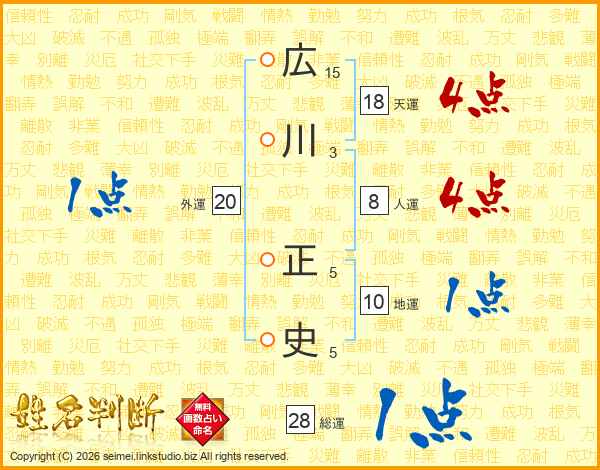 あなたの人生を表す1番重要な運勢です。生涯を通じて影響する総合運となり、主に50歳以降の晩年期に影響を及ぼします。苗字と名前の合計画数。